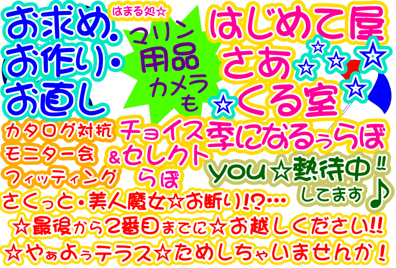 〜オーシャンサービス・セカンドステージ〜 ☆ちゃれん陣-季茶ってプラザ☆ 〜びぎにんぐあん・シーズン〜 ☆お気に入りをハンドメイド☆ 〜ソーイングクラブ・クローバー〜 〜ぬうもんさぽぉたぁ・モモーバー〜 ☆06-6863-7771--泳.縫.写.整.走.焼.淹-お電話.now☆ ◎見た目はC級-頭脳はB級-サポートA級◎ 《1店で何度も…楽しめるゥ♪》 |